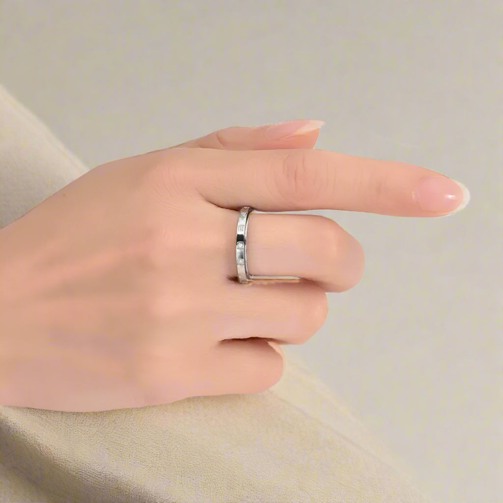 This ring is made with stainless steel and cubic zirconia, with a width of 3mm.